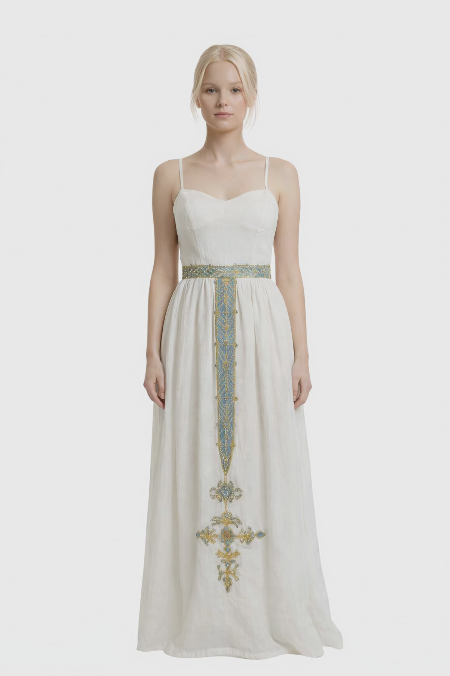 - Intricate vertical embroidery panel from waist to hem
