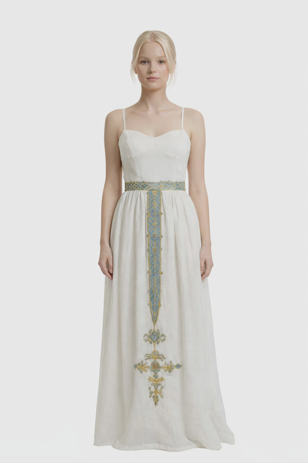 | A graceful handwoven cotton gown defined by its refined silhouette and intricate central embroidery. Crafted from breathable natural cotton, the dress features a delicately embroidered panel that runs from the waist to the hem, creating a striking vertical motif that elongates the figure. Gold metallic threads and delicate stone embellishments add a subtle shimmer, blending artisanal craftsmanship with timeless elegance. Designed to move effortlessly from daytime occasions to evening gatherings, this piece reflects both heritage-inspired detailing and modern sophistication. |