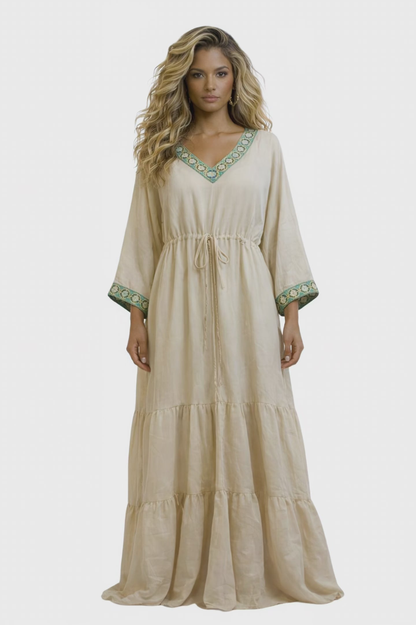 | A timeless gown crafted from handwoven cotton and adorned with striking heritage-inspired embroidery. The dress features an elegant embroidered panel that begins at the neckline and flows vertically through the center, creating a refined silhouette that naturally elongates the body. Gold metallic thread and delicate stone embellishments add subtle brilliance, highlighting the intricate craftsmanship of the design. With its flowing structure and artisanal detailing, this piece blends traditional inspiration with modern elegance. |